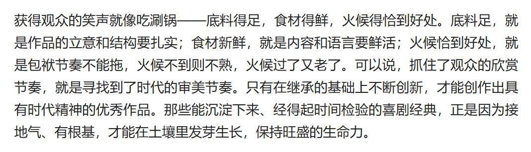 “赢得观众笑声,恰似吃涮锅——汤底要醇厚绵长,食材须新鲜饱满,火候更要稳准精当。”