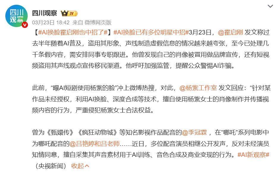 王劲松被AI剪辑进虚假医疗广告,靳东遭AI冒充直播带货,霍启刚的形象甚至出现在非法集资宣传页中。